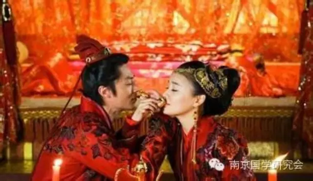 宋代以后,合卺之礼演变为新婚夫妻共饮交杯酒。《东京梦华录·娶妇》记载:新人“用两盏以彩结连之,互饮一盏,谓之交杯。饮讫,掷盏并花冠子干床下,盏一仰一合,谷云大吉,则众喜贺,然后掩帐讫。”这个仪式的象征意义是意味深长的。