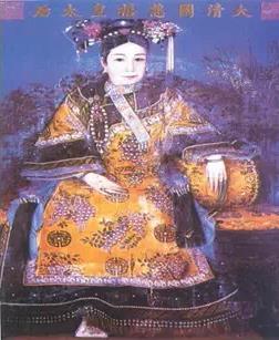 皇后朝褂均为石青色,用织金缎或织金绸镶边,上绣各种纹饰。领后均垂明黄色绦,绦上缀饰珠宝。朝褂都是穿在朝袍外面,穿时胸前挂彩,领部有镂金饰宝的领约,颈挂朝珠三盘,头戴朝冠,脚踏高底鞋,非常华美。