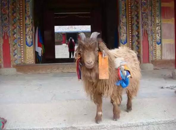 在西藏的许多寺庙及其附近,常常会有或单独的、或三三两两的脖颈上系着红布条没有主人的羊只。其实这些羊本来都是有主人的,主人把它们放生了,使它们重归自然,成为自由的羊,免去了挨宰遭杀之罪。习惯上,这些羊被叫做放生羊。