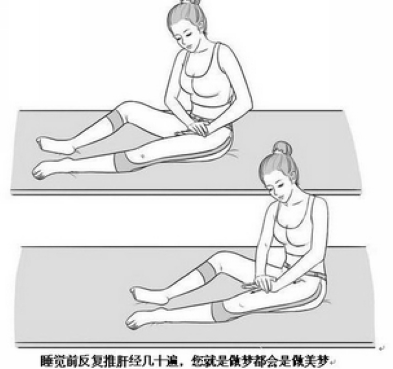 坐在床上,右腿向前伸直,左腿弯曲平放,双手交叠,压在大腿根部,沿着大腿内侧肝经的位置,稍用力向前推到膝关节的,反复推动,四五十遍,然后换另一只腿同样的手法。可以隔着衣服,如果是在皮肤上的话就涂些润肤油,效果更好。每晚推一推,疏肝理气,活血化瘀,去肝火,保养妇科,改善面部气色。