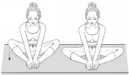 坐下来,屁股下用一个折成两个手掌厚的毯子垫一下。然后曲膝,使脚心相对,脚掌并拢,脚跟尽量往里靠。双手抓住脚尖,膝盖向两侧打开,尽量往地上贴,这就是“蝴蝶式”了。做这个动作的时候,脊背要挺直,双膝有节奏地向两边地板振动。