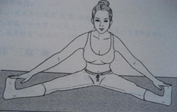 ①人平躺在床上或地上,两腿尽量向两边水平展开拉10分钟,这需要别人帮助拉开腿。