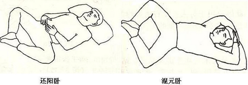 混元卧:把还阳卧再提高层次的练法是混无卧-仰卧,两脚心相对,腿似环,两手重叠或交叉轻轻的放在头上,手心对着头顶百合。这个姿势既能补肾气又可放松头部,对失眠、神经衰弱有较好的治疗效果。上面两臂围成一个圈,可以使肾气不往生殖器上走,而是拉到中脘的深处;下面两腿围成一个圈,有利于周身气血沿腿循环到身体的当中。