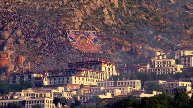 作为节日的序幕,哲蚌寺展佛是最令人瞩目的仪式。早上8点钟,哲蚌寺背后的半山腰上,在第一缕曙光的辉映下,伴着凝重、庄严的法号声,一幅500平方米的、用五彩丝绸织就的巨大释迦牟尼像徐徐展露出祥和的容颜……数万名信徒和深受感染的游客无不双手合十,顶礼膜拜。