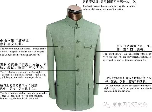 其三,袖口三粒纽扣表示三民主义(民族、民权、民生)。南京国学研究会 官方网址:http://www.njgx.org/