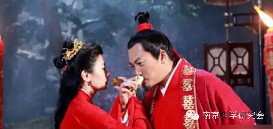 宋代以后,合卺之礼演变为新婚夫妻共饮交杯酒。《东京梦华录·娶妇》记载:新人“用两盏以彩结连之,互饮一盏,谓之交杯。饮讫,掷盏并花冠子干床下,盏一仰一合,谷云大吉,则众喜贺,然后掩帐讫。”这个仪式的象征意义是意味深长的。